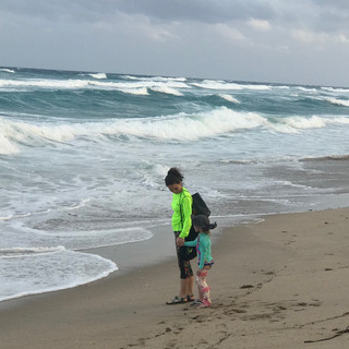 After dinner she wanted to go to the beach and since West Palm Beach is where Brent and I spent our honeymoon we took some time to drive around and found a beach. The tide was up and it was very windy so walking on the beach, looking for shells, and trying to avoid the little man o war all over the beach was about all we could do but we had fun doing it.