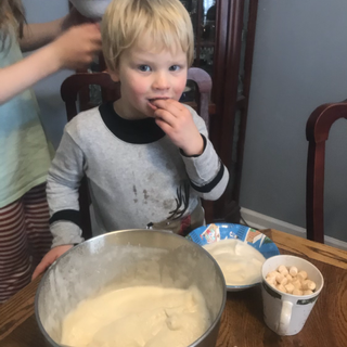 Boone helped make the hot cocoa during one of his warm ups. He and I read a couple of books together by the fire and a little while later, once the snow bowl was filled, we all made snow cream together. It really was an incredible family day!